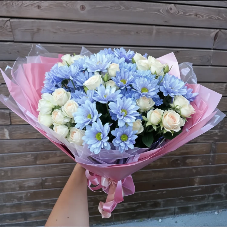 Этот изысканный букет — настоящее произведение искусства, в котором фиолетовые хризантемы и белые розы сливаются в гармоничную симфонию цветов.